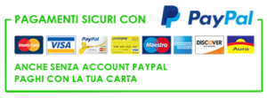 Se non sei registrato su Paypal, puoi pagare comunque con la tua carta di credito in totale sicurezza attraverso il circuito Paypal senza registrazione. Vengono accettate tutte le carte di credito o carte prepagate del circuito VISA e MASTERCARD, nonchè le carte a marchio DISCOVER, AURORE ed AMERICAN EXPRESS.